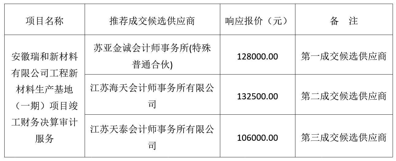 安徽瑞和新材料有限公司工程新材料生產基地(一期)項目竣工財務決算審計服務預成交結果公示